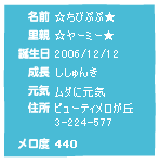 ![]() 絶対Bですよ・・・パソしすぎだから。 それに、どこにも穴が開いてない様に見えるんですけど!! はぁ・・・去年まではAだったんだけど。どうなるんでしょうかね? えっと、PIECE FIELD様からブラインドタッチバトンという、面白そうなバトンを見つけてしまいました! *ルール* キーボートを見ないこと。携帯の人は親指を見ないこと。 誤字・脱字はそのまま。 「Backspace」や「クリア」はご法度! だそうです。では、さっそくやってみますね! Q1:生年月日を教えてください。 1995年4勝ち12日 Q2:TV番組と言えば何? みのもんた!(なzr?) Q3:カッコイイ(かわいい)有名人といえば誰? とくにいませんね・・・(って、これでいいのか?) Q4:辛い食べ物と言えば何? とおがらし Q5:あなたのチャームポイントを教えてください。 ときどきぶりっ子になる子と?かなぁ・・・ Q6:あなたの虫に対する思いを教えてください。 おねがいだから、頭のわまりをぶんぶんとぶのはやめてください。 Q7:カラオケの十八番は何?歌手も教えてください。 いや・・・からおけいったことないんですけど。 Q8:5秒で「ブラインドタッチなんか余裕だぜ!」と入力してみましょう ぶらいんどたっちなんかよつうだけ! Q9:バトンを回す5人を教えてください。 やりたいかた、ぜひぜひど~ぞ! 正しくは続きをご覧ください。 昨日は大変見苦しいもの(?)をお見せしてしまって、すいませんでした